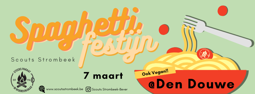 Ook dit jaar organiseert scouts Strombeek-Bever haar jaarlijks spaghettifestijn! 🍝 Zaterdag 7 maart verwelkomen wij je graag in feestzaal Den Douwe waar een topteam klaar staat om je een overheerlijke spaghetti (ook vegan saus aanwezig) te serveren.